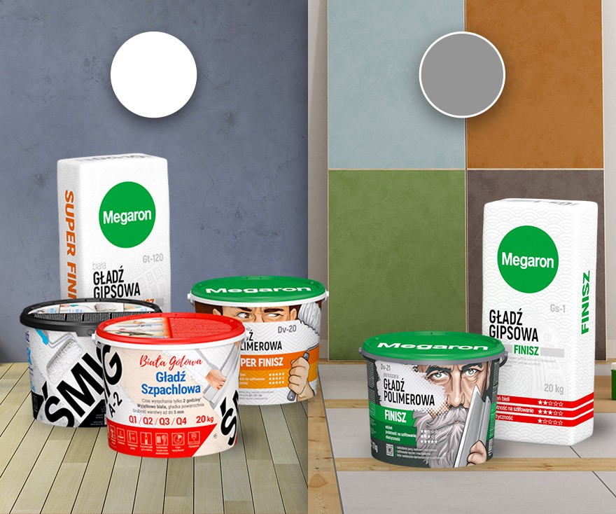 No ale dobra, trochę się rozpisaliśmy a w zasadzie pewnie interesuje was odpowiedź na pytanie czy lepiej użyć szarej czy białej gładzi? W tym przypadku jednak to nie dyscyplina olimpijska i ciężko wskazać jednoznacznie zwycięzcę. Oba rodzaje mają swoje zalety i dedykowane miejsca aplikacji, tak więc jest to sprawa nieoczywista i zależy głównie od preferencji użytkowników. Jeżeli zależy nam na śnieżnej bieli to polecamy szczególnie ŚMIG A-2, ŚMIG A-11 oraz Megaron Dv-20 i Megaron Gt-120. Jeżeli jednak biel nie jest konieczna i powierzchnia może być równie dobrze jasnoszara to zachęcamy do wypróbowania gotowego Megaron FINISZ Dv-21 oraz sypkiego Megaron FINISZ Gs-1.