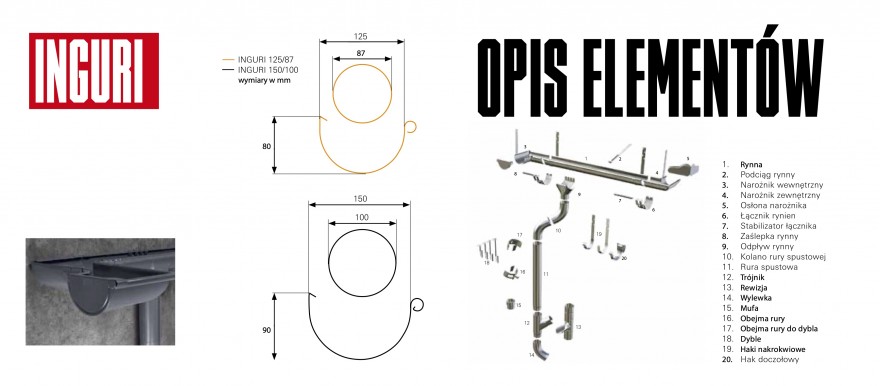 Systemy INGURI® 125/87 i 150/100 są kompletnymi systemami rynnowymi produkowanymi z najwyższej jakości stali powlekanej organicznie lub powłokami metalicznymi ALUZINC. Wszystkie elementy systemów zostały zaprojektowane w sposób zapewniający poprawne spasowanie i łatwość oraz szybkość montażu systemu. Kształt i głębokość rynien zapewniają skuteczne odprowadzenie wody nawet podczas intensywnych i długotrwałych opadów.