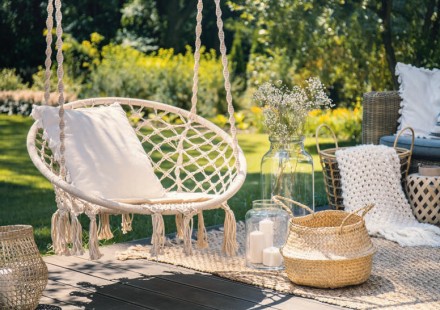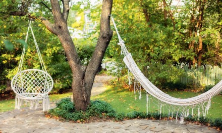 I jedno, i drugie to rozwiązania łączące w sobie walory huśtawki oraz hamaka, doskonałe dla tych, którzy dysponują niewielkim ogrodem albo nie posiadają go w ogóle (mając jedynie balkon lub loggię). Hamaki brazylijskie to wiszące siedziska o analogicznej konstrukcji do tradycyjnego hamaka, z tym że ich boki zostały zebrane i rozpięte na jednym drążku nośnym, co nadało im formę siedziska. Wyściełane miękkimi poduszkami stanowią fantastyczny mebel do bujania. Takie niewielkie, pojedyncze hamaki w formie sznurkowego podwieszanego fotela można bez problemu zamontować nawet na niewielkim balkonie – wystarczy jedynie silne mocowanie, np. do płyty balkonu sąsiada z góry. Podobne zastosowanie mają plecione huśtawki określane mianem bocianiego gniazda – zadowolą one zarówno posiadaczy pięknych obszernych ogrodów, jak i właścicieli niewielkich przestrzeni zielonych. Bocianie gniazdo doskonale sprawdzi się w roli pełnofunkcjonalnej bujawki wśród wysokich drzew, z powodzeniem odnajdzie się również w kąciku tarasowym, na balkonie czy loggii, zapewniając wypoczynek w lekkim kołysaniu nad ziemią. Walorem tego typu mebla podwieszanego jest bardzo lekka ażurowa forma. Konstrukcja bocianiego gniazda jest bowiem zwykle ręcznie pleciona w technice makramy wokół stelaża na planie koła (stąd nazwa), co sprawia, że doskonale wpisuje się w letnie zakątki w stylu boho. O ile tradycyjne hamaki sprzyjają zażywaniu spokojnego snu, o tyle podwieszane fotele są doskonałym miejscem do czytania czy przeglądania stron internetowych na tablecie lub telefonie.